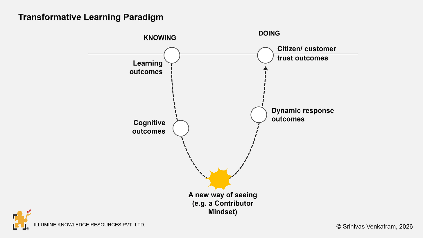 Transformative learning includes within its scope the acquisition of specific skills and capabilities. But, when we seek to build intrinsic motivation to serve, or an expanded vision of one’s role, or when one is trying to change the way one interacts with citizens, a skilling paradigm is not enough. Such deep behavioral changes need a transformative learning paradigm.